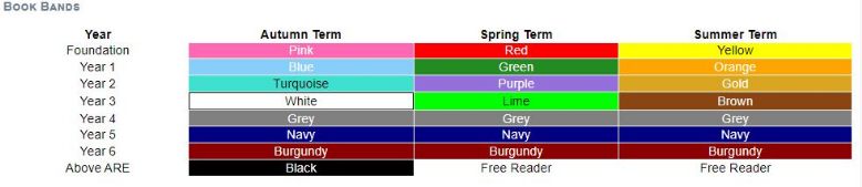 The grid below shows the typical progression through the book bands, for a child working at Age-Related Expectations. This is just a guide, we all know children do not make progress at the same rate. If you have any questions or concerns, please speak to your child's class teacher.