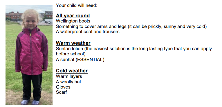 Parents are asked to send children to school in clothes with long sleeves and long trousers that you don't mind getting grubby, on this day. Long Sleeves and trousers ensure children are covered up as they explore the different areas of the wild area and prevents injury and irritations. Please bring waterproof clothing and Wellington boot in the case of rain.
